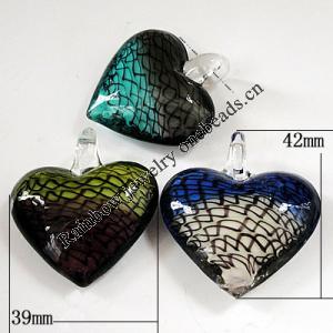 Silver Foil Lampwork Pendant, Mix Color, Heart 44x52x13mm Hole:About 5mm, Sold by Group